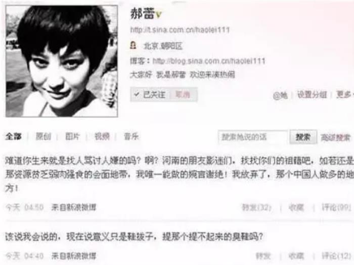 然而,她却发现网上有一位河南籍的网友多次留言对她“先行谴责、多次辱骂”,郝蕾不堪其辱的选择了硬刚,和这位网友于留言区互怼了起来。