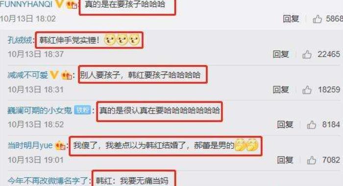 这些回复、议论无不透露着那股可爱劲儿、以及对韩红“要孩子”的喜欢。