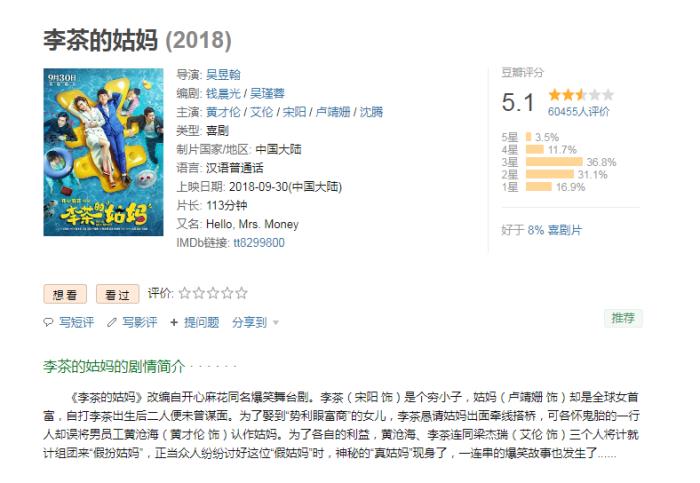 从目前的豆瓣评分来看,李茶的姑妈仅为5.1分,之后评分还会有所变化,但不可否认的是这部剧比之前开心麻花拍摄的电影评分都要低,口碑也并不尽如人意。