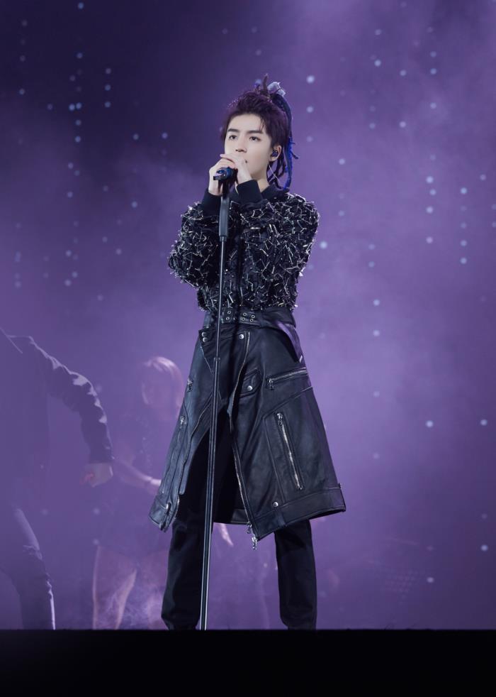服装搭配也处处彰显帅气本色。先是布灵布灵的刺绣外套,为舞台带来闪亮元素;接着下搭黑色皮裙,别致的设计像件皮衣似的裹在腰上,叠穿长裤朋克范儿十足,一举一动尽显狂野魅力。
