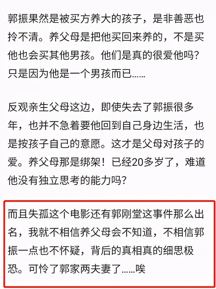 还有网友觉得,《失孤》电影那么出名,郭刚堂的故事更是广为流传,郭振的养父母也许知道当事人是郭振,他们却选择隐瞒,让郭刚堂找儿子找了这么多年,如此没有道德的两个人,明明是在犯罪。
