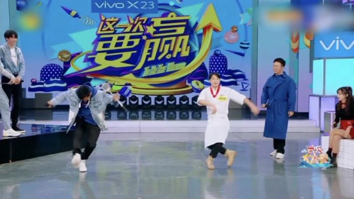 出场时和大家一起表演了一段《失恋战线联盟》的唱跳。现场还模仿厨师的国产舞,被何炅称作唱跳全能的“舞王”。