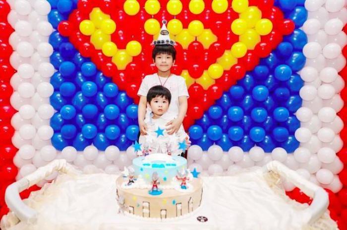 从照片能看出,黄圣依在自己的游乐园里给安迪举办了生日会,背景布置了一个大型气球墙,用各种颜色的气球拼出了超人胸前的S图案,安迪面前的生日蛋糕也是奥特曼主题,看来小安迪对英雄形象十分着迷,也是个小男子汉呢。