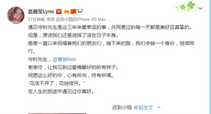 #曹骏蓝盈莹分手# 现在明星分手好文艺啊,不合适就是不合适,整得两人各准备一篇散文一样,还谢谢你,谢谢陪伴,真是没sei了这个社会人越来越……假 ?