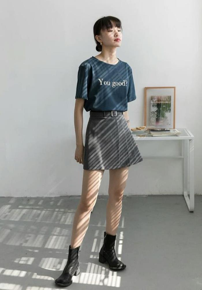 上衣的搭配可以是各种颜色的T恤,就看怎样选择颜色才能搭配出不一样的效果。灰色的百褶短裙有一种干练风格。想要穿短裙又想适合显得酷一点,这种款式的短裙就无比适合。搭配一双马丁靴,霸气范立马展现。