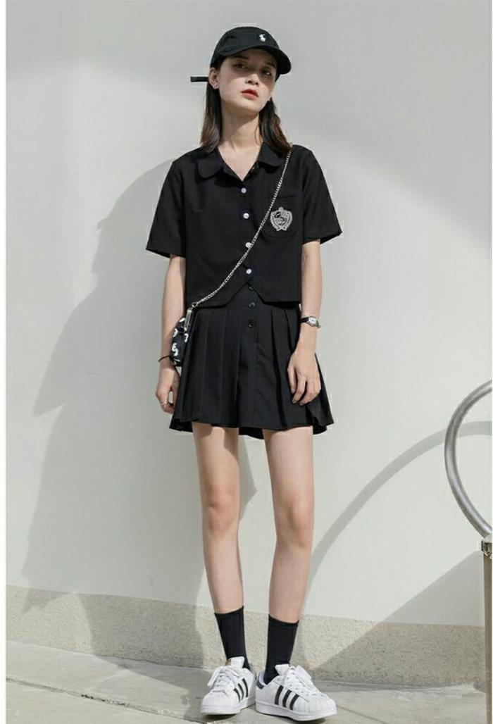 这套穿搭就比较适合年轻的女性选择了,有褶皱的短裙,增加了衣服的层次。搭配黑色衬衫式领口的上衣,气质也非常符合学院的风格,并且不乏时尚,配一个链条包,潮流气息满满。