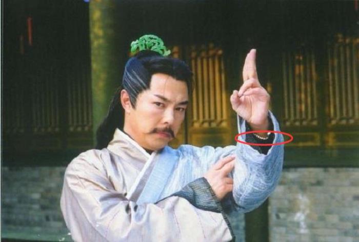 《倚天屠龙记》中张铁林扮演的杨逍,在发功的时候,我们可以看到他衣服袖子里有一只大金的手表。不得不说,皇阿玛是真有钱,到哪都是穿金戴银的。