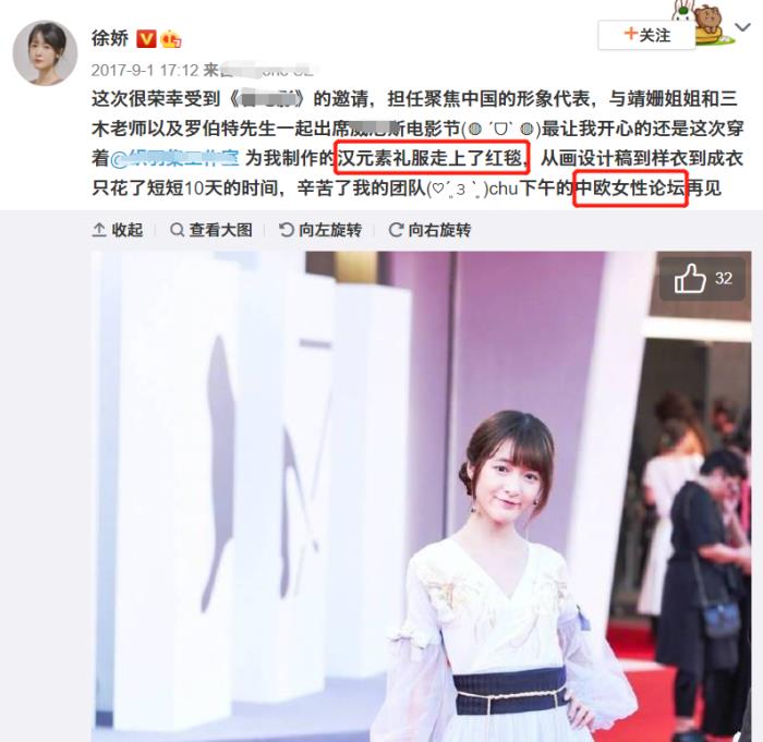 徐娇不仅在日常中经常穿着汉服,还曾将汉服穿到某国际电影节以及国际论坛上,其对汉服推广的努力可见一斑。