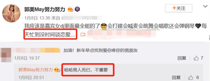 在面对网友的祝福,希望她能够找到疼爱她的男朋友的时候,郭美美表示:男人不重要,还说自己十分全能,每天忙到没空恋爱。