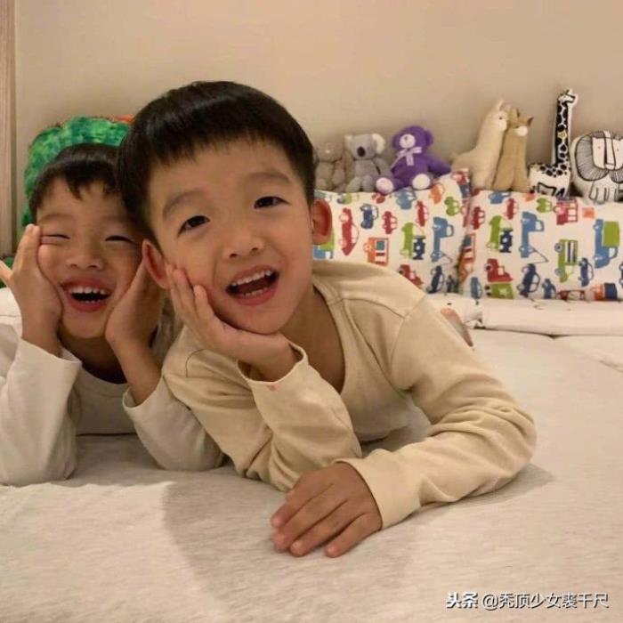 照片中,双胞胎面对镜头趴在床上,双手捧住小脸蛋,笑得眉眼弯弯。