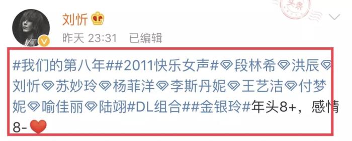 5月8日晚,2011届《快乐女声》的季军刘忻晒出了当年的选手们聚会现场的照片,细心标出未到场选手的名字并配文:我们的第八年,年头8+,感情8-。