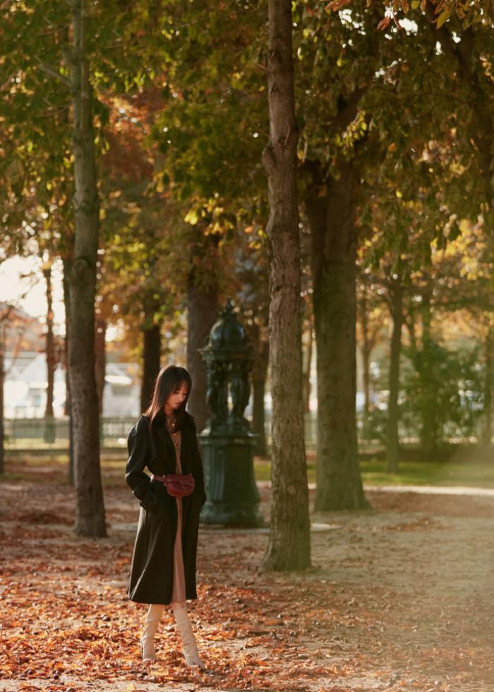 大衣本身的收腰效果一般,但我们却可以人为的改善这样的视觉感。像郑爽一样搭配一个酒红色的腰包,不仅仅是将气质提上去那么简单,同时也是利用了包包的颜色做了明显的混色处理。