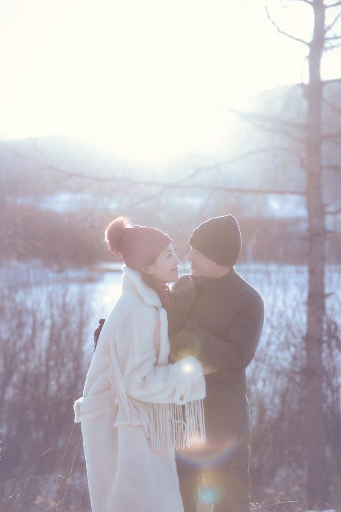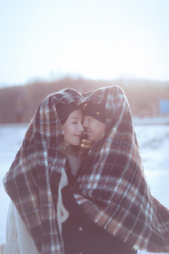 照片中,两人牵手漫步雪地,时而相拥,时而对视,时而亲吻。