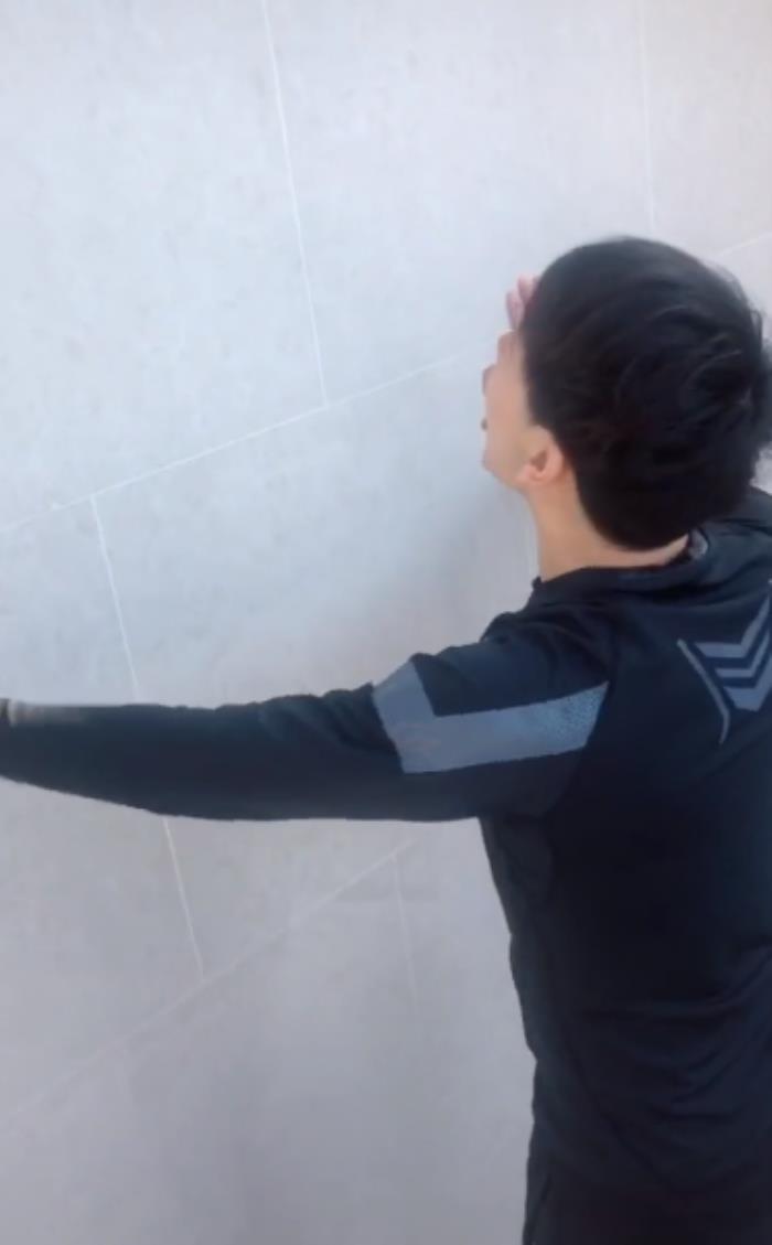 当镜头拉近时,网友才发现谭杰希原来是在站在地上扶着墙假装做俯卧撑,十分搞笑。