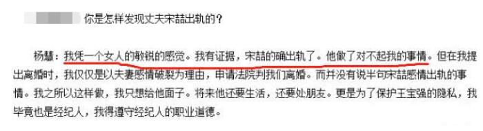 这个微博停止更新是在2016年6月份,那时的杨慧向宋喆提交了离婚诉讼。杨慧接受采访时表示:“我凭一个女人敏锐的感觉(发现宋喆出轨)。我有证据,宋喆的确出轨了。他做了对不起我的事情。”