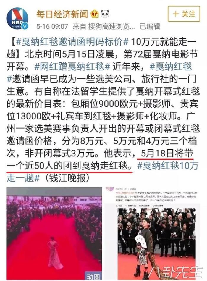 发展到现在,只要给得起3万块,就能到戛纳红毯上走一波。根据媒体爆料,广州一家选美赛事负责人将会在5月18日带领一个近50人的团到戛纳走红毯,这真真是把红毯当景点经营了▼