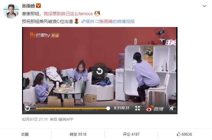 2月1日晚,张雨绮在社交平台分享了一段那英在《姐姐2》中夸奖她的视频,说道:“谢谢那姐,我没想到自己这么famous,预祝那姐乘风破浪C位出道”。