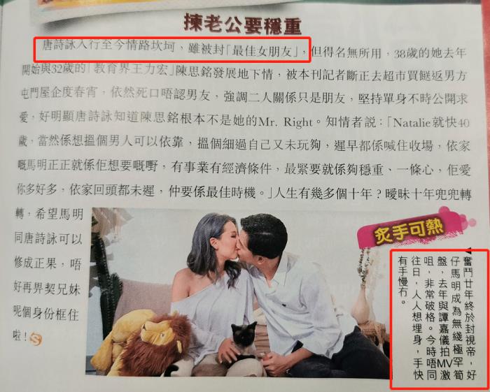 唐诗咏也算是情路坎坷的代表了,一直都遇人不淑,2017年和洪永城分手后还被曝与教育界的陈思铭夜会拍拖,虽然有“最佳女友”的称号,但如今已经38岁的唐诗咏依旧没找到自己的Mr.Right,这次重新搭上马国明,大概也是兜兜转转才发现陪在自己的身边人。