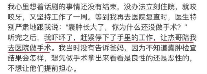 可因为手头上还有工作没完成,话剧还在排练中,谢娜又坚持着工作了一周。工作结束后去医院复查,结果被医生痛斥一顿:"囊肿长大了,你为什么还没做手术?" 吓坏了的她这才停下工作,接受医生的建议。