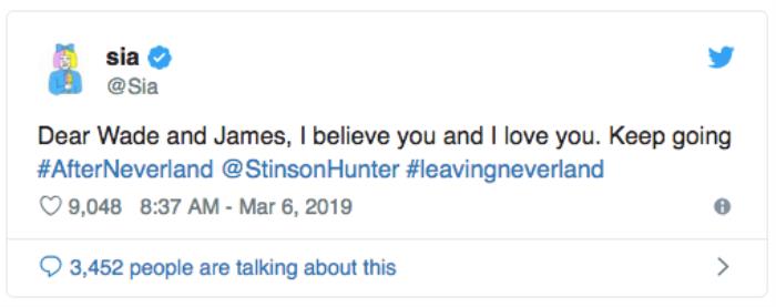 澳大利亚王牌创作歌手Sia Furler则发推特表示相信影片中的两位受害者。著名脱口秀节目《艾伦秀》的主持人艾伦•德杰尼勒斯则呼吁,让所有人都去观看这部纪录片。