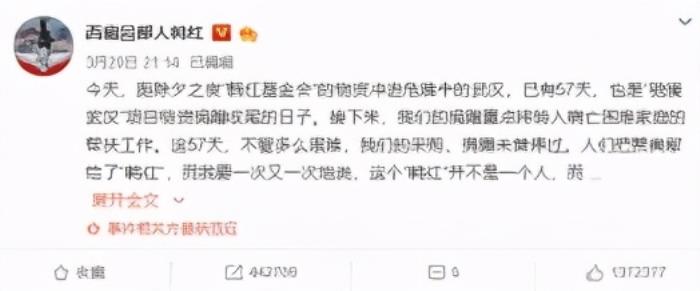 去年年初,韩红曾发文表示她和她的基金会从除夕开始就一直忙碌,感叹自己并不是一个人,有不少朋友都愿意相信她,贡献出了力量。