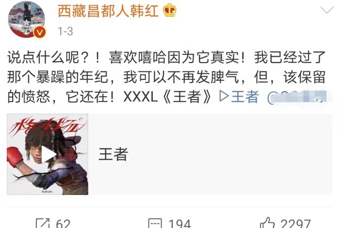 即使韩红现在把大部分精力放在了做公益上,但她也没落下自己的歌唱事业。前段时间韩红推出了嘻哈曲风的新歌,作出了较大的突破,与说唱歌手展开合作。