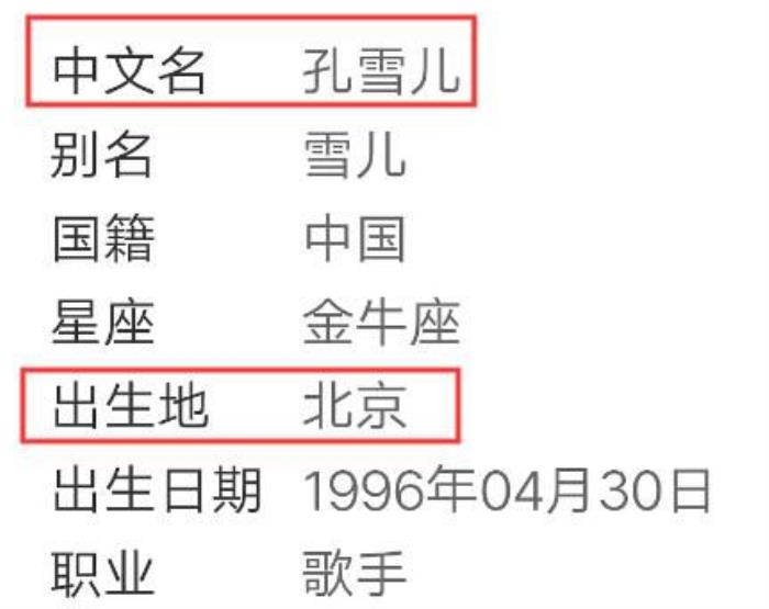 据悉,网上有的资料提到,孔雪儿出生在湖北,有的则显示其出生于北京。