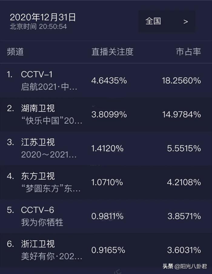 2020年12月31日夜晚,央视与各大卫视同期举办跨年晚会,虽然在阵容方面,各家都安排上了最强阵容,但收视率方面的差距仍然比较明显。#2020跨年晚会#