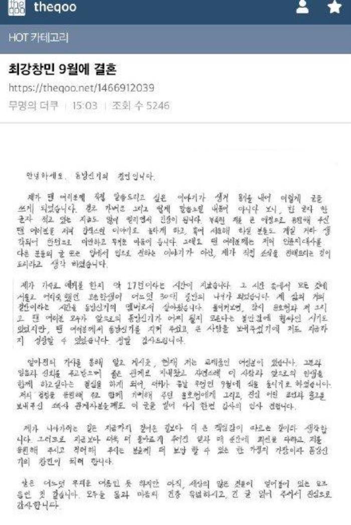 6月12日,东方神起成员32岁的沈昌珉在社交平台发布自己的手写信,宣布自己将于9月份与圈外女友结婚。而他表示现在亲自宣布这个消息是因为不想让自己的粉丝从别人的口中得知这个消息。