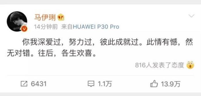 还记得马伊琍在个人微博上的发的那句话:“你我深爱过,努力过,彼此成就过。此情有憾,然无对错。往后,各生欢喜。”