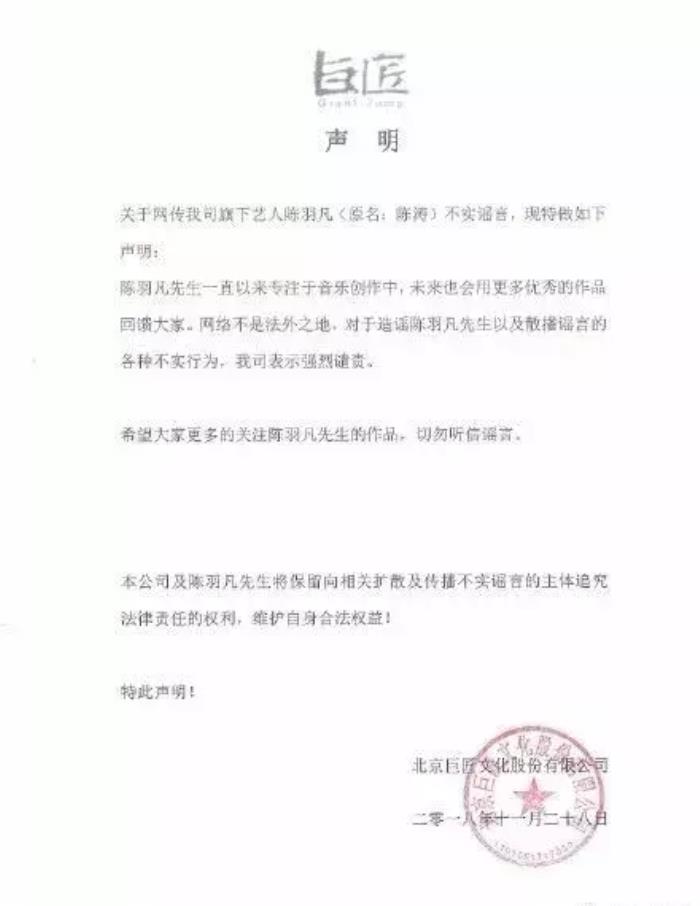 随后陈羽凡所在经纪公司删除了上午发的声明,让网友更加证实了这件事。