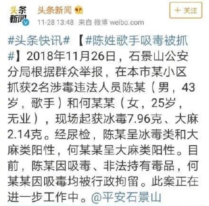 11月28日下午,警方公布某陈姓歌手吸毒被抓住,不久就被网友证实此歌手正是羽泉组合的成员陈羽凡。