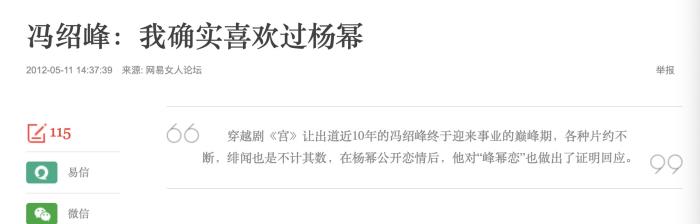 不过冯绍峰方面一度有些余情未了,他说自己有那么一阵子真的动过感情,但无奈两人最后性格不合适,只好分开。