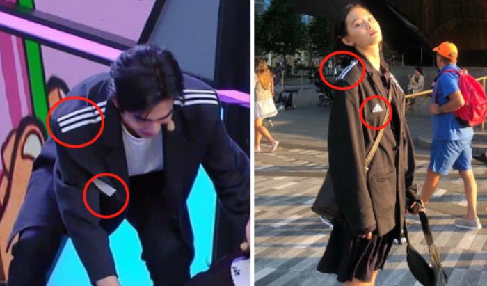 第二件像情侣款的是黑色西服,从款式和细节上看,这两件衣服是同一品牌的,肩部都是白色的三条杠,胸前都有名牌标志,不过赵佳丽没有挡住标志,而宋威龙用白色贴布贴住了。