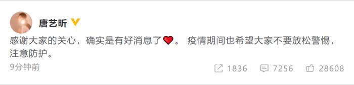 今天,唐艺昕在自己的社交网站发文表示:感谢大家,确实有好消息了。正是发文确认怀孕好消息,一时间也是吸引不少人的围观和祝福。同时唐艺昕还不忘记叮嘱粉丝们一定要好好防控疫情,不能松懈,果然就是很宠粉。