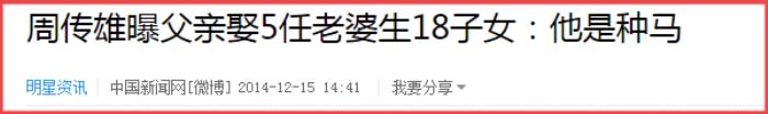 后来为了躲避战乱,周家逃亡到台湾,周爸雄风不减当年,再婚迎娶第5任太太,在50岁高龄,生下了周传雄,所生子女超过18个。后来周传雄开玩笑说,“我爸爸就是种马啦!”
