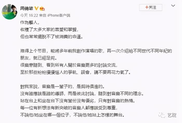2月2日下午,周传雄也发文回应此事,他表示:“没有谁应该是谁的导师,站在台上和坐在台下没有辈分没有优劣,只有对音乐的热情。”