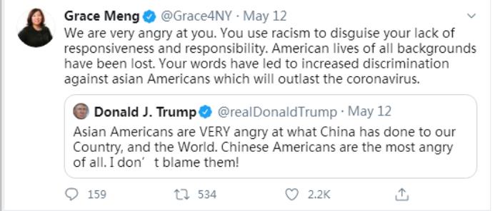 据美国全国广播公司(NBC)报道,华裔女议员、民主党全国委员会副主席孟昭文直言不讳地表示,“我们对你很愤怒”。孟昭文指责特朗普是在用种族主义言论来转移人们对他应对疫情不力的注意力。还有人直言,美国总统并不能代表亚裔美国人的意见。
