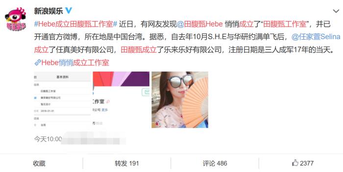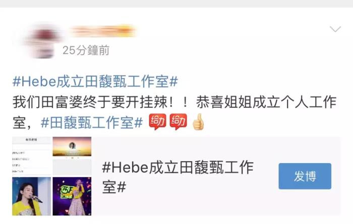 2月23日,Hebe田馥甄成立了自己的工作室,与陈嘉桦、任家萱选择的以家庭为主的方式不同,田馥甄选择了继续专注音乐。