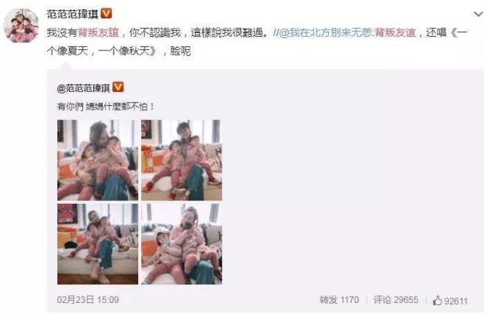 2月23,范玮琪就此发微博表示:有你们 妈妈什么都不怕!