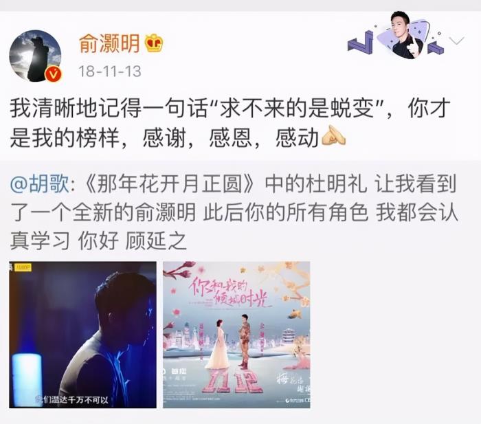 “《那年花开月正圆》中的杜明礼,让我看到了一个全新的俞灏明,此后你所有的角色,我都会认真学习。”