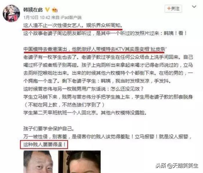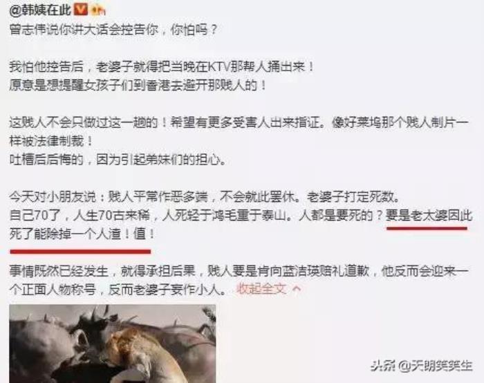 其实仔细想想,曾志伟这招儿完全就是跟马苏学的,先状告韩姨,封住韩姨的嘴,一切韩姨知道的内幕就都变成了”案件信息“不得随意公布。这样一来,既显得他有理,也让大众屏蔽了更多对他不利的信息。但是曾志伟势力强大,韩姨自己也发微博了称:自己70岁了,要是老太婆因此死了能除掉一个人渣,值!