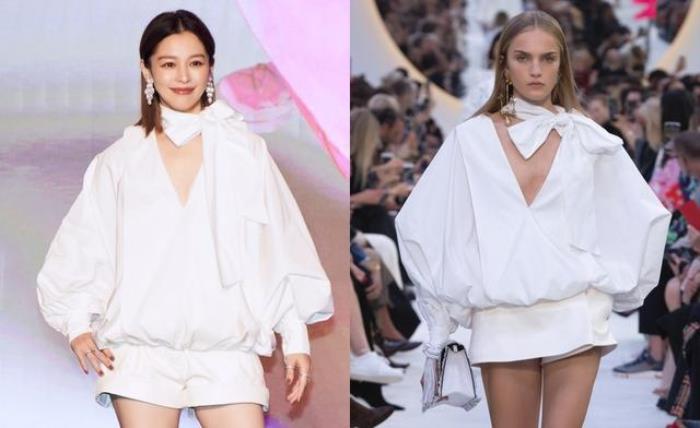 徐若瑄这一件V领的宫廷袖上衣来自Valentino,对比模特和徐若瑄两者之间的差别并不大,而且徐若瑄更是赋予了这件上衣甜美的气质,整体看上去更加富有朝气和灵气一些。不得不说徐若瑄选择白色的单品实在是太对了,和她本人的气质很般配。