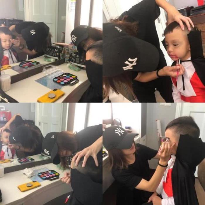 徐若瑄为儿子化妆,看得出儿子非常配合她,很是听话。而她也很有耐心的为他打造这个怪异的造型,相信他心中对这个妈妈肯定很满意。