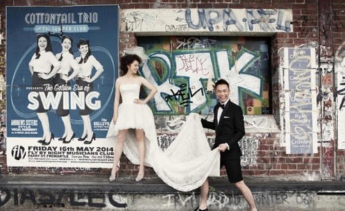 10日徐若瑄唯美婚纱照曝光。Vivian身穿由好友贾永婕送赠,近百万订制的婚纱,一件缀满蕾丝充满高贵古典美,另一件则是带点摇滚味,相当有特色。 而取景方面就由Fremantle假日市集涂鸦牆、波浪岩、金黄麦田区到天鹅湖,两人脸上都挂住幸福满泻的笑容。