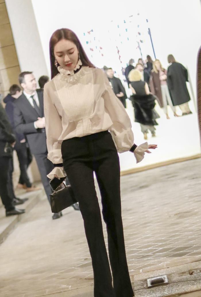 雪纺纱的上衣上身之后凸显出郑秀妍的女人味儿,浅杏色的颜色和郑秀妍本身的皮肤也特别的契合,白色衬衫的袖口是花边袖口,领口处也是高高的宫廷领,透露着郑秀妍的甜美感,下半身搭配黑色的超长西装裤,西装裤把本身身材就很完美的郑秀妍显得更加完美。