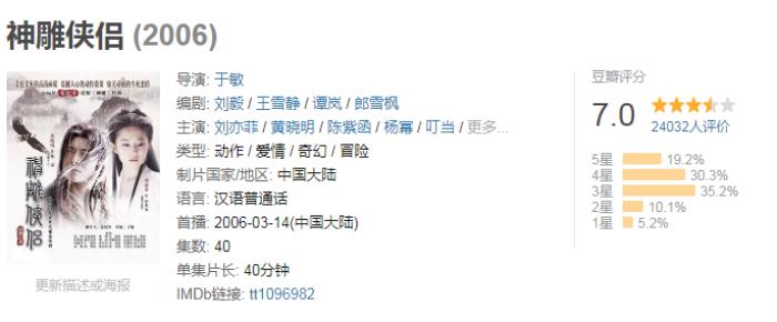 事实上,06年版《神雕》虽然很多方面不尽人意,但对那些完全没有“95版情怀”的“非港剧迷”来说,依旧不失为一部精品好剧,更是播出后当时最被热议、话题度和流量最高的国民大爆剧。根据当时最被业内看重的“尼尔森收视率”统计,(和目前通行的“索福瑞收视率”系统,并非同一体系),收视率高达8.8%。