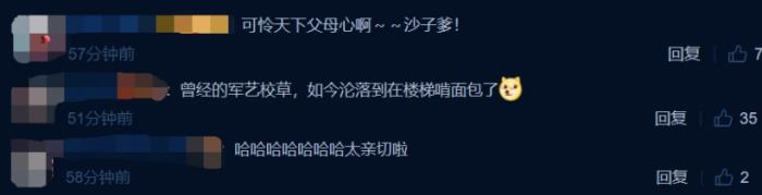 有网友看到动态后评论“可怜天下父母心啊”,还有网友调侃他“曾经的军艺校草,如今沦落到在楼梯啃面包了”,更有网友直言他的举动“太亲切啦”。