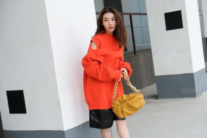 亮色服装是生活的调味品,越是显眼越是亮丽,总能带来身心愉悦,程晓玥这件西瓜红的套头衫十分吸睛,仔细看会发现这是拼接款,领口处是T恤下面是大款毛衣,肩膀处恰巧露出一块打破沉闷,现在的程晓玥穿衣越发时尚了,她把更多的精力放到事业上,散发着独立女性的魅力。