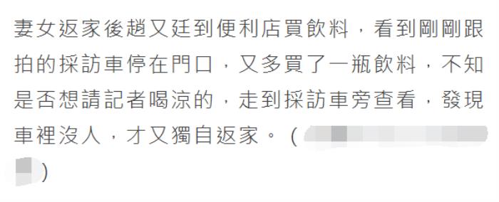 这次高圆圆被记者“曝光”,赵又廷还是尽“地主之谊”,在便利店买了饮料,步行至记者车前停下,似乎想请记者喝饮料,但发现车内无人后,赵又廷只能转身回家。